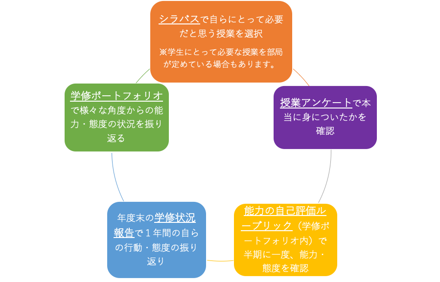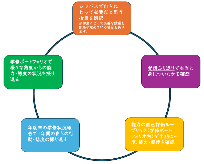 さらに、自立的な学びを促すために、シラバス、受講ふり返り、学修状況報告、学修ポートフ ォリオを結びつけて、さまざまな角度から能力・態度を確認できるよう整備しています。