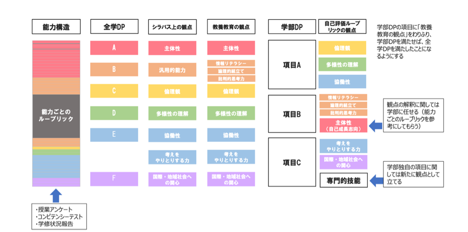このように長崎大学では在学中に培うべき能力基準を全学ディプロマポリシーおよび各部局のディプロマポリシーに定め、シラバス、受講ふり返り、学修状況報告、能力の自己評価ルーブリックは一貫性をもって設計されています。