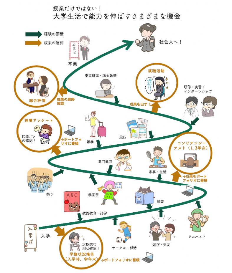 学生は学修ポートフォリオシステムに自らの学修成果を随時蓄積します。学修ポートフォリオを振り返ることで自らの成長の軌跡を確認することができます。また,学修ポートフォリオはメン ター教員による学生の指導・助言の資料として利用されます。さらに,卒業時には大学における 学修成果の総合評価のための資料としても活用されます。