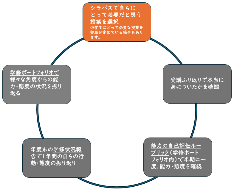 まず、各授業でどのような能力・態度を身につけることができるかはシラバスの「知識・技術以外に、この授業を通して身につけて欲しい力」を確認してください。